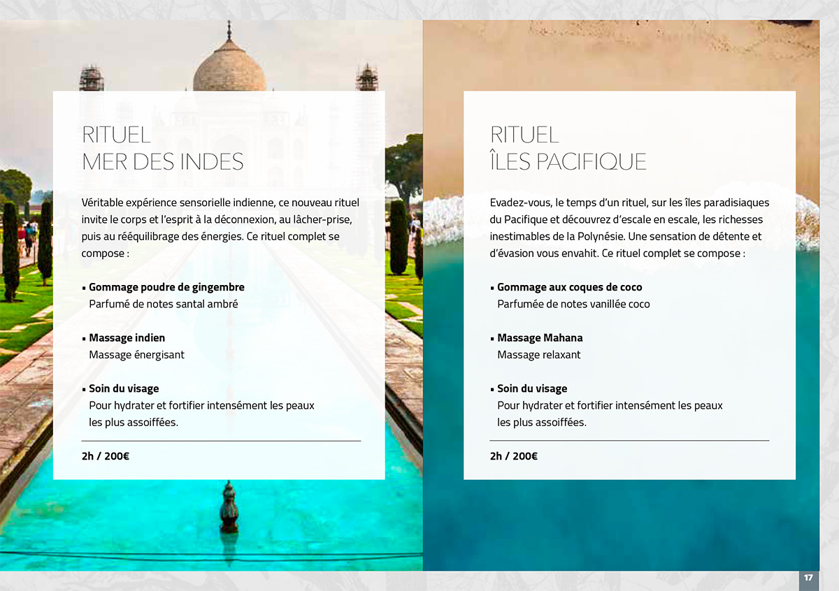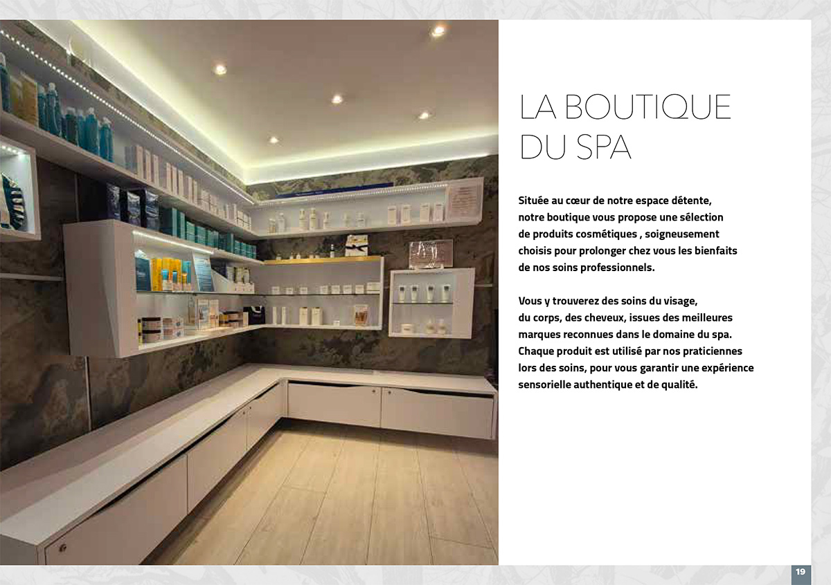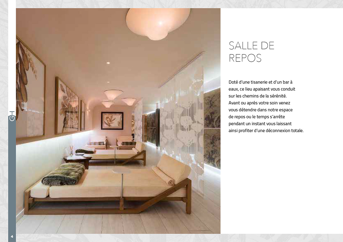 Composé de cinq cabines thématiques, dont une cabine double de 36m², cet espace offre un dépaysement complet dans les mains expertes d’une équipe d’esthéticiennes et masseuses entièrement dédiées au bien-être des clients.