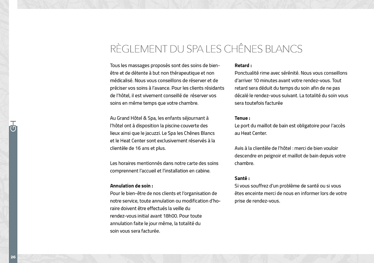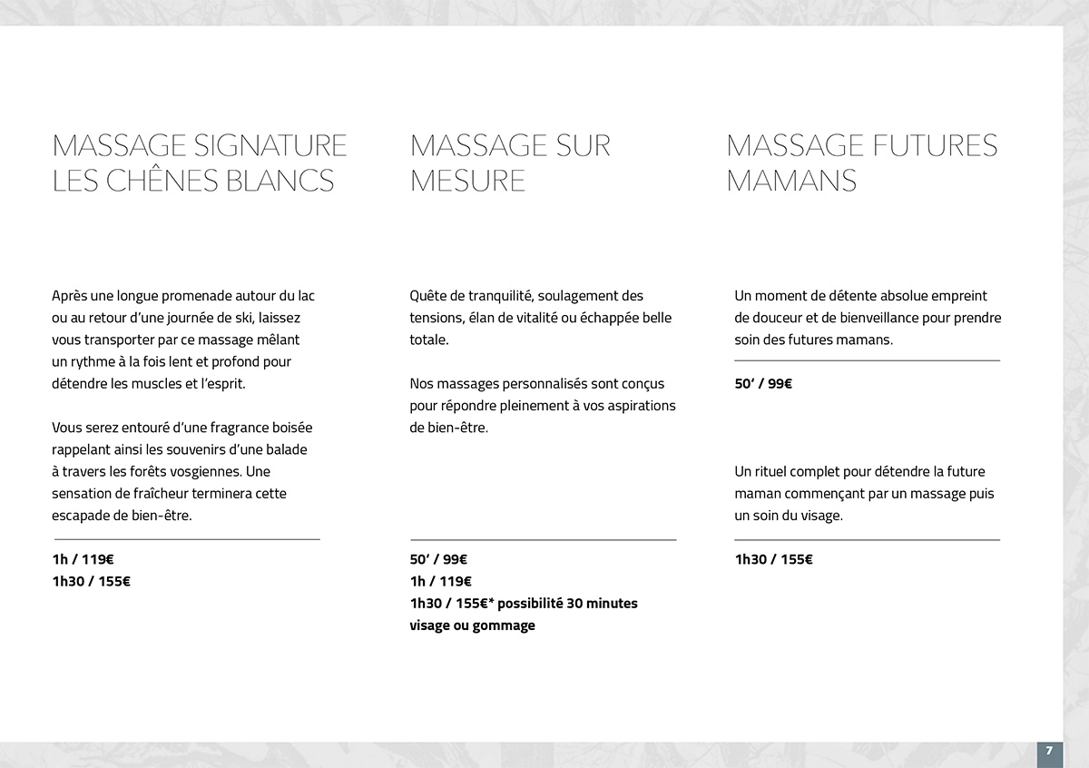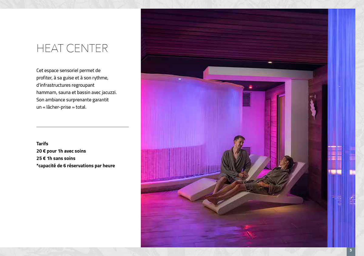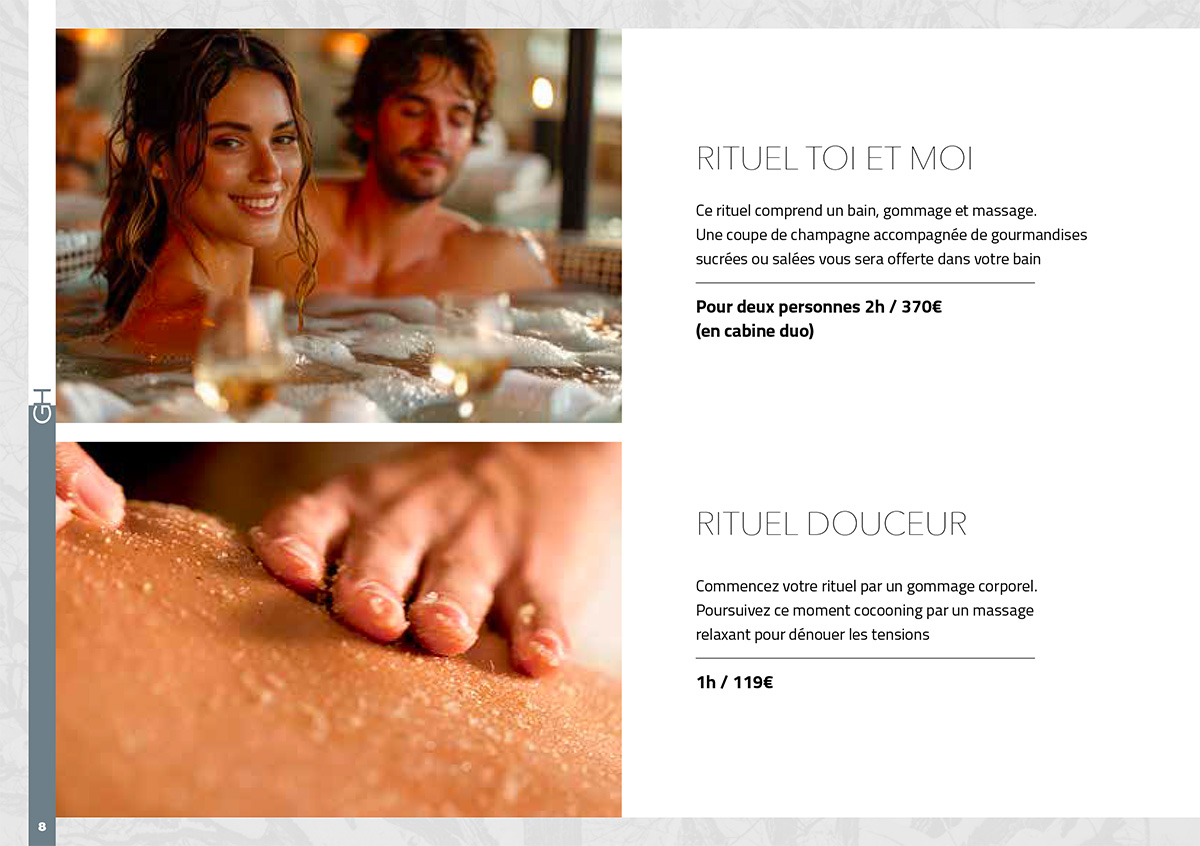 Composé de cinq cabines thématiques, dont une cabine double de 36m², cet espace offre un dépaysement complet dans les mains expertes d’une équipe d’esthéticiennes et masseuses entièrement dédiées au bien-être des clients.